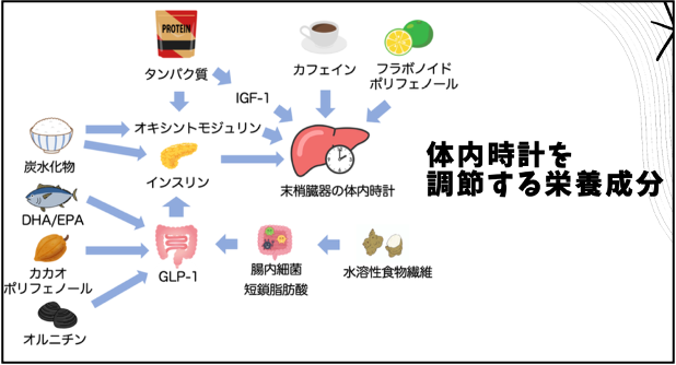これまでに、培養線維芽細胞、マウスでの化学発光による体内時計の可視化手法から、カフェインやノビレチン、生薬成分(柴胡、猪苓)などが体内時計調節作用を持つことを明らかにしてきた。また、マウスを用いた解析からは、炭水化物-インスリン-末梢時計、たんぱく質・アミノ酸-IGF-1-末梢時計などの経路も見えてきた。さらに、EPA/DHA、カカオポリフェノール、L-オルニチン、短鎖脂肪酸などがGLP-1などのインクレチンを介してインスリン機能を高めることで、末梢時計の調節を強めることも分かってきた。一方で、植物油や脂肪酸による体内時計調節機能はまだ調べる余地があり、今後の研究展開が待たれるだろう。